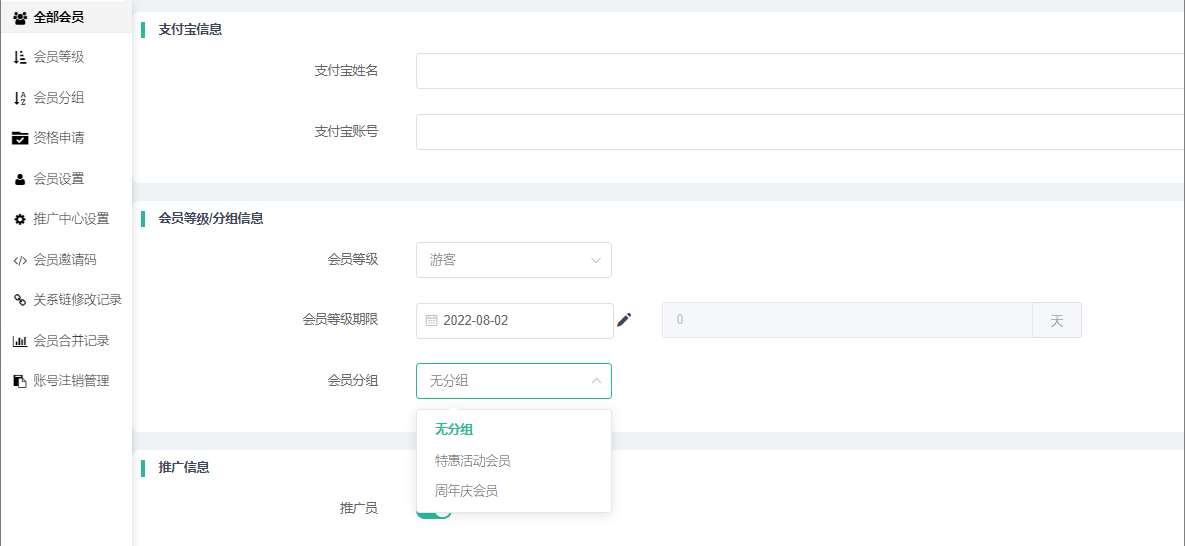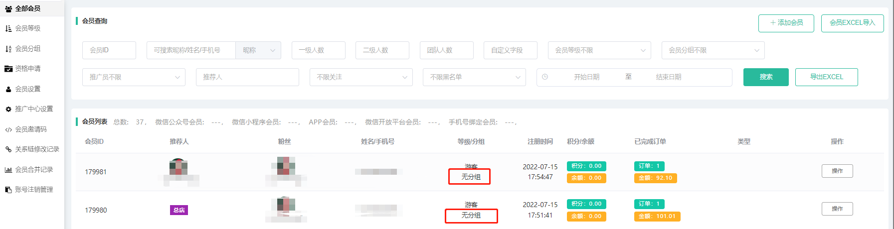 二、会员不分组则默认“无分组”,可通过会员管理 -- 操作-- 会员详情,对会员进行分组调整。