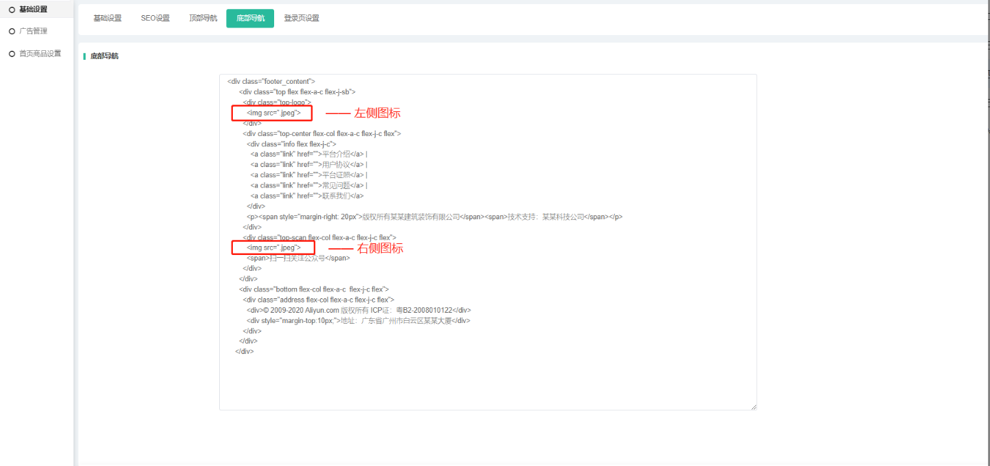 可自定义设置底部导航logo、二维码、导航链接、备案号、公司信息等;
