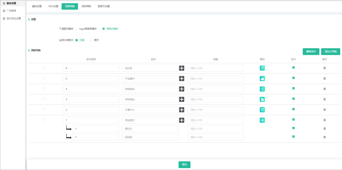 添加顶部导航:支持添加一二级导航,显示顺序数字大靠前显示,编辑/删除导航,是否显示导航.