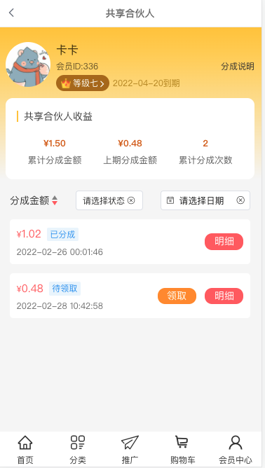 2、在此页面可查看到会员等级信息、共享合伙人收益