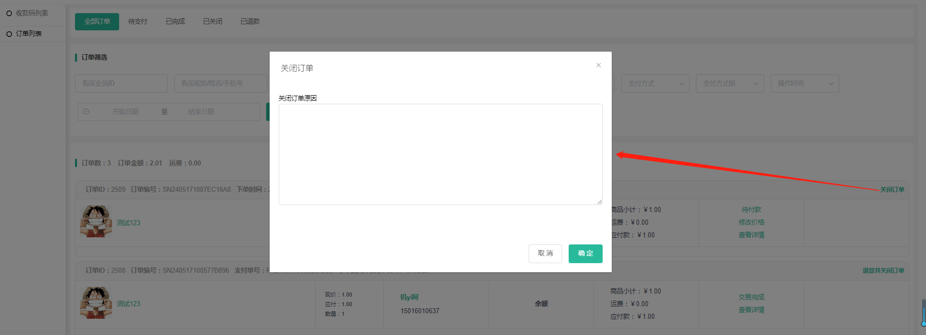所有收款码订单:待支付、已完成、已关闭、已退款。