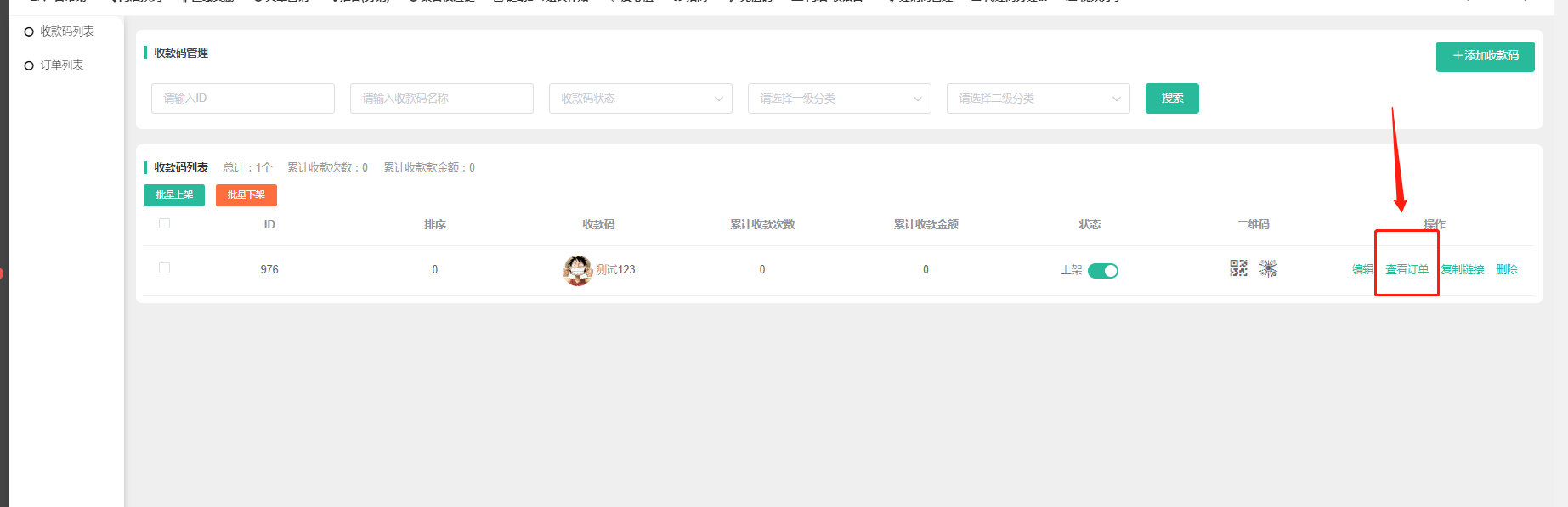 可根据收款码ID、收款码名称、收款码上下架状态、收款码分类快速查找,可查看到收款码累计收款次数、累计收款金额(已完成订单)、查看对应扫码买单订单.