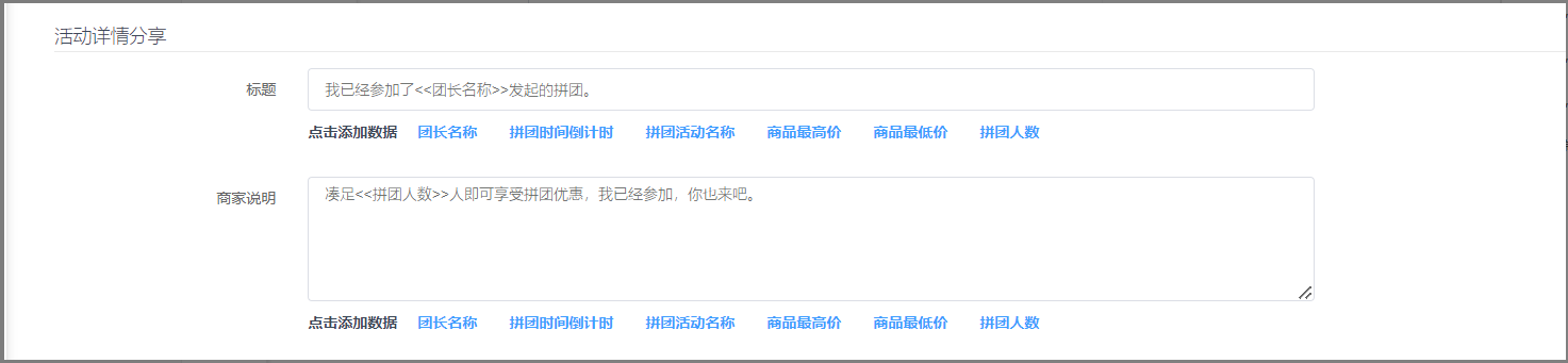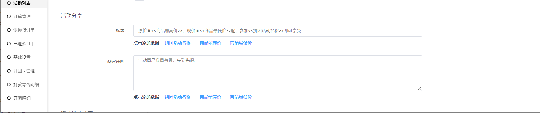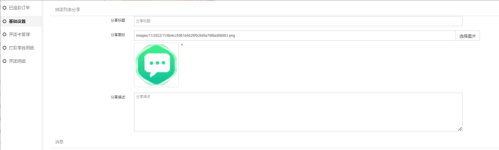 7,拼团列表分享设置,设置好后拼团聚合页分享按照设置的内容分享,若不设置则按照商城设置—分享设置处分享