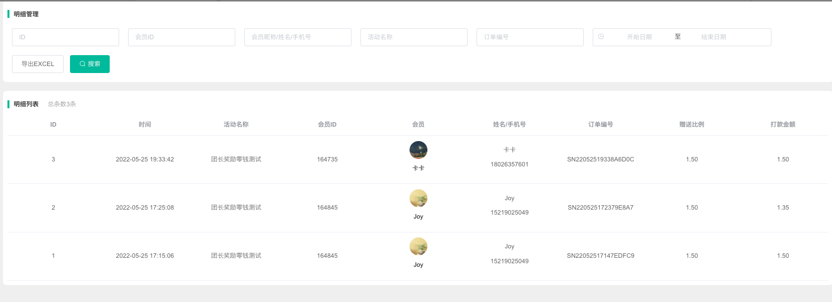 1, 参团会员成团自动开团、开团卡开团的明细