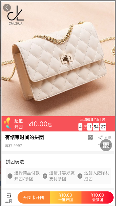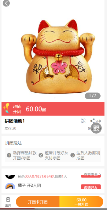 2, 在活动详情页可选择开团/参团